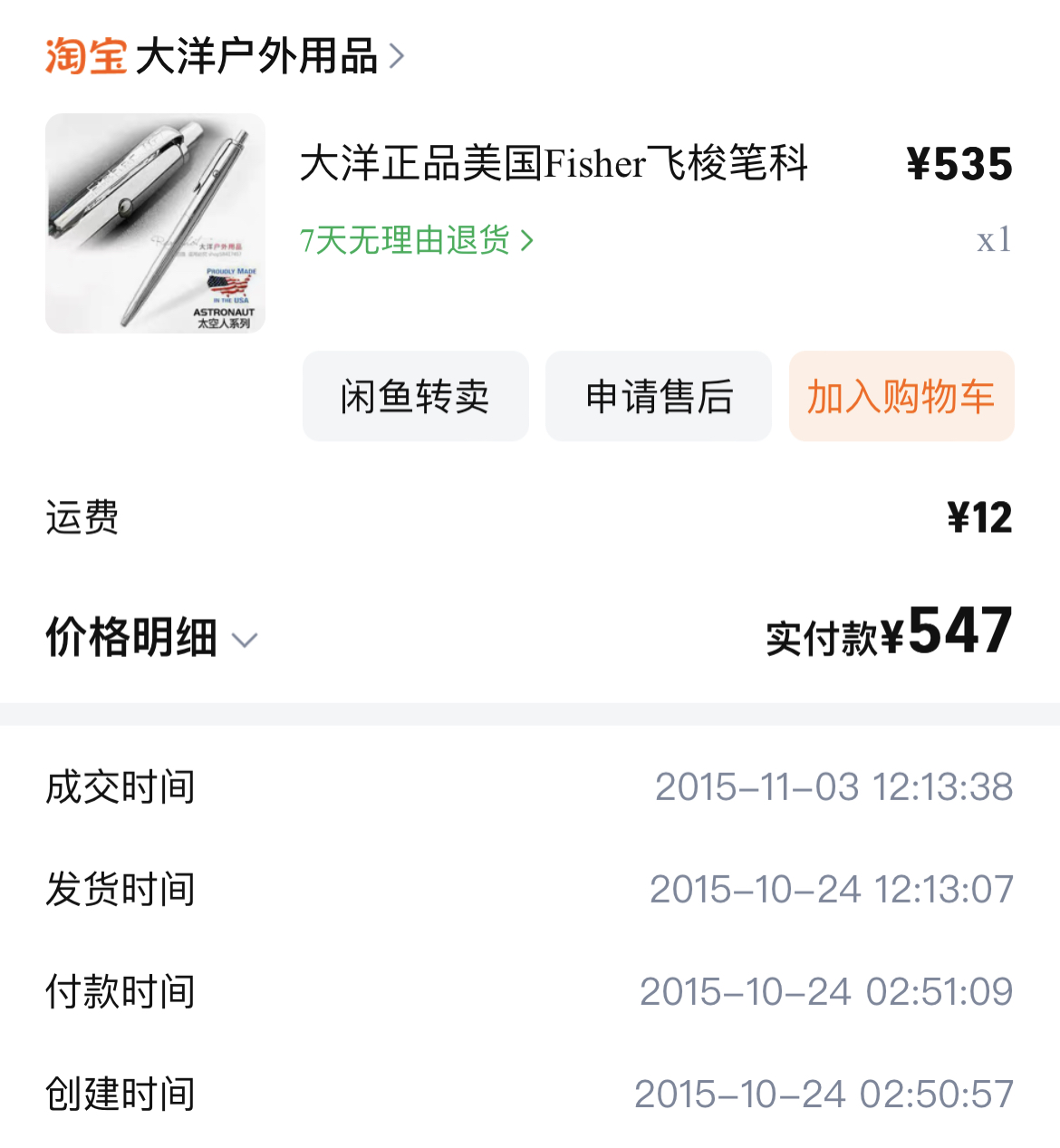 当FISHER先生将第一支太空笔的样品交付给NASA之后,NASA极尽所能的对其进行了各种严苛的测试。最终,太空笔通过了测试,开始了它的太空之旅。1967年,NASA以2.95美元每支的价格一次性采购了400支太空笔。1968年,阿波罗七号载人飞行任务,太空笔进入了太空。 这就是后来我们知道的大名鼎鼎的AG-7。所谓AG,即 Anti Gravity 反重力,“ 7” ,则是为了纪念它第一次进入太空执行的阿波罗7号载人飞行任务。