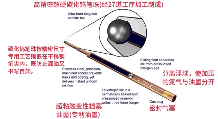 但其实真正称得上特殊的是笔中的笔芯:全密封,杆中充有压缩氮气,依靠气压推动油墨书写,由此摆脱了对重力的依赖。也因其非牛顿流体特性的特制墨水,油墨只在笔珠滚动时受到剪切力才液化,它不仅能在太空失重环境下使用,还可在-30至120摄氏度的极端温度下、水中等特殊场景,以及石头、浸油表面等特殊材质上顺畅书写,并具有3600米的书写长度(另外的说法是4500米)。与之相比小米巨能写的标称书写长度为1600米,考虑到太空笔芯要细不少的尺寸确实令人惊奇。