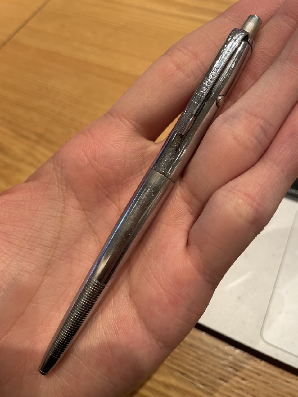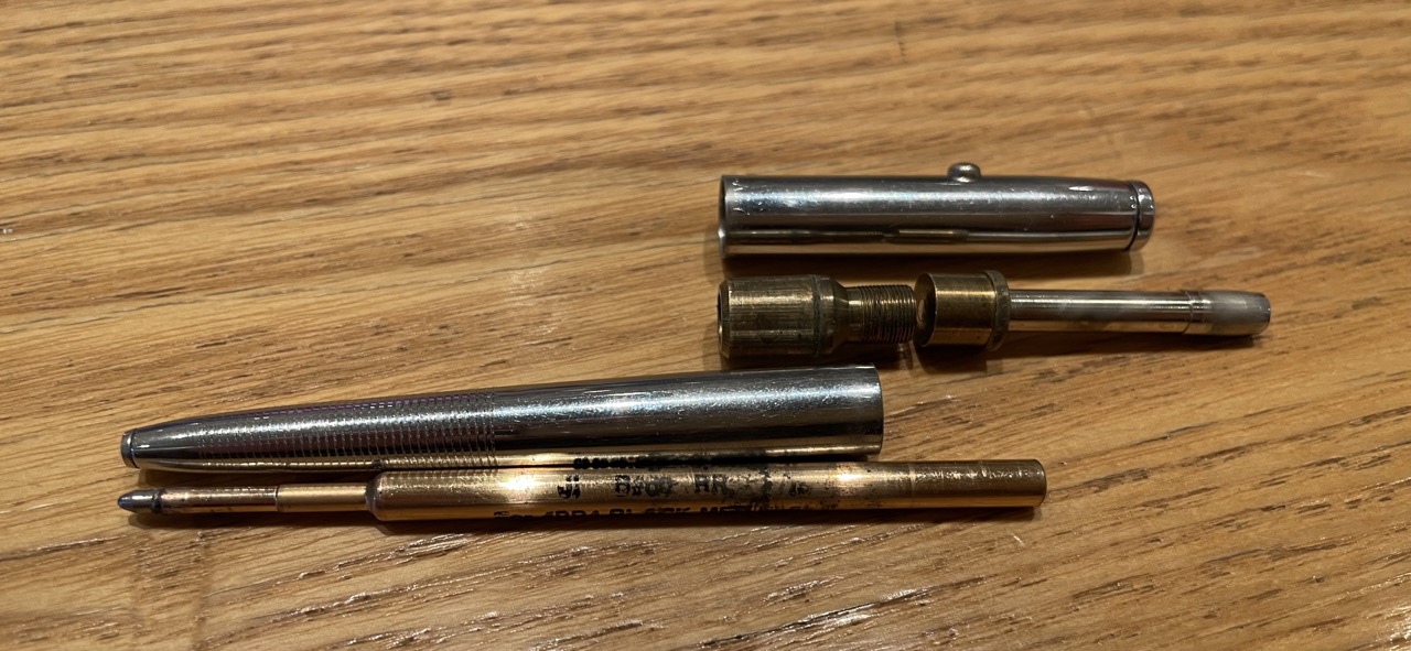 见过的朋友可能对我对衬衣的喜爱有所概念。和衬衣一起,这根银白色的笔从未因上面提到的意外解体而丢失过部件,并此笔理论上拥有终身质保——在美国国内,你既可以将自己使用无墨的笔芯以每根6美元的成本重新填充(但这根笔芯全新仅7.95美元/国内售价58人民币令这件事并不划算),也可以将诸如我手里这根笔寄回公司维修。据我刚刚所作的调查,基本上飞梭公司均会以更换一根新笔的方式处理这类质保。更换一根新笔?可以说是件好事但又会失掉这根功能良好的、跟随多年的旧笔,怎么想也都不是最优解决方案,就让我继续这根笔的旅程吧。